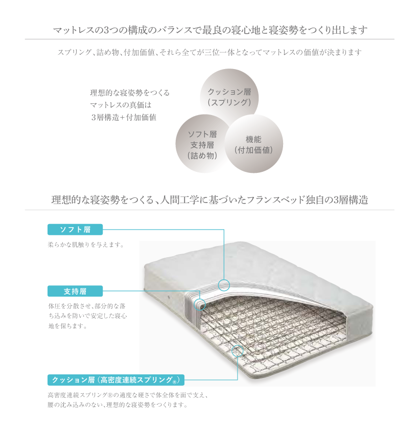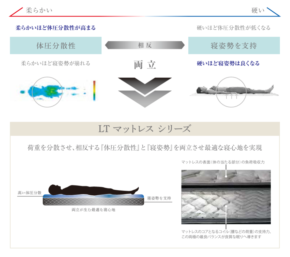 これまでのマットレス選びは、「体を包み込む柔らかさ」か「腰を支える硬さ」か、どちらかを選ぶ必要がありました。 フランスベッドの『ライフトリートメント(LT)』は、その両極を一本の鋼線で実現。「肌あたりは優しく、体は凛と支え抜く」。 その最良のバランスが、あなたを心地よい眠りへと解放します。