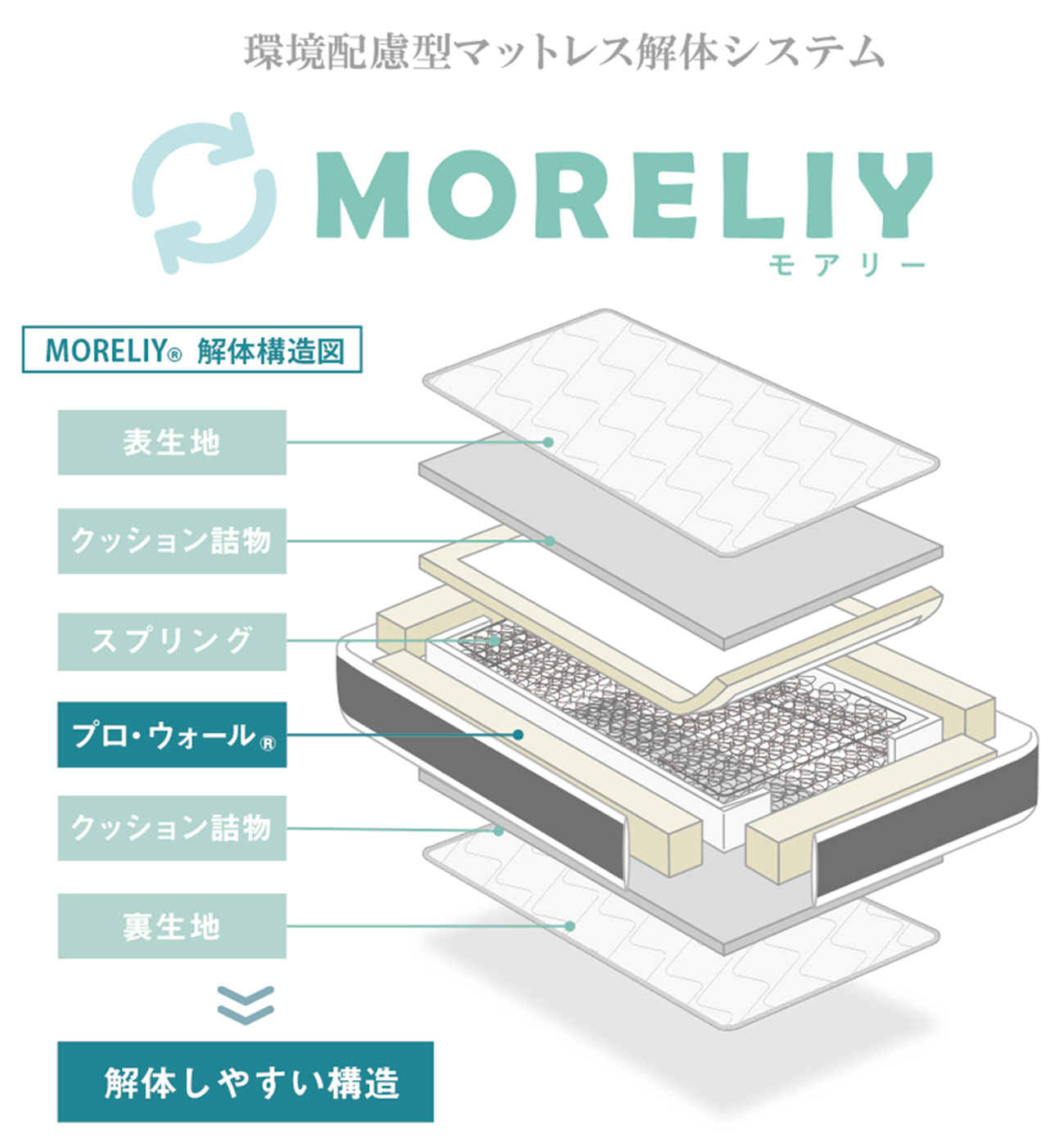 独自構造「MORELIY(モアリー)」は、スプリング、詰め物、生地をお客様自身の手で容易に分解・分別することを可能にしました。廃棄物を減らし、リサイクルしやすくすることで、地球環境の保全に貢献するサステナブルなマットレスです。