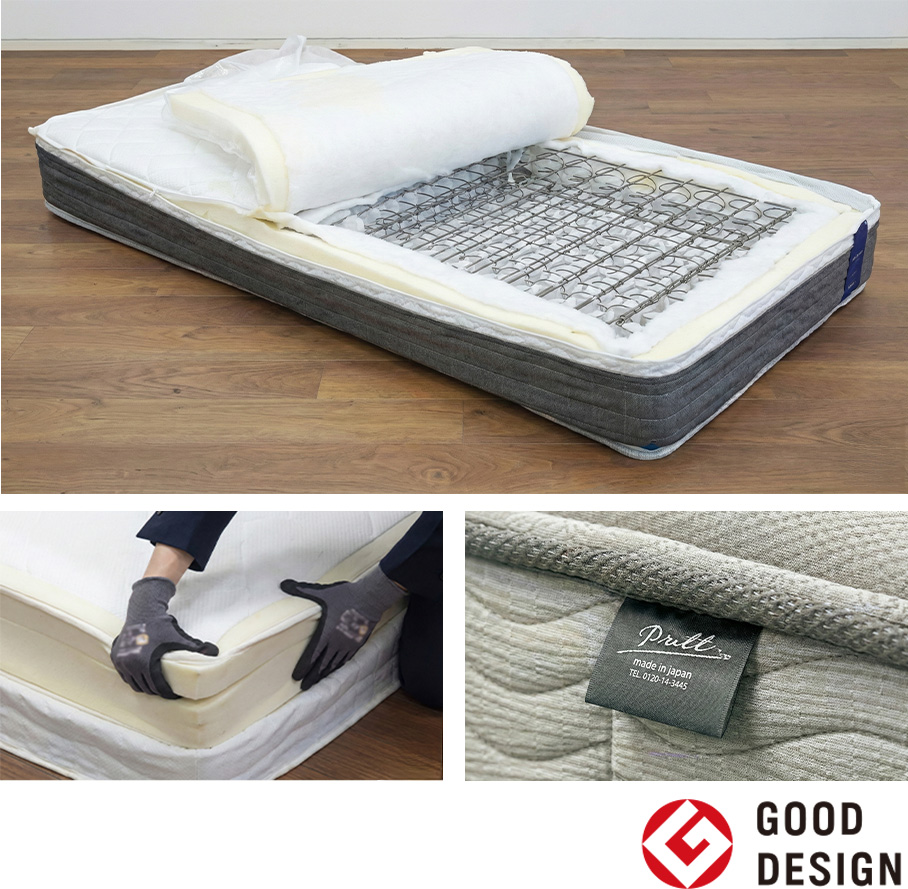 マットレスの材料がそれぞれ分解・独立しやすくスプリングに他の材料が干渉しない構造にすることで解体を容易にする構造です。