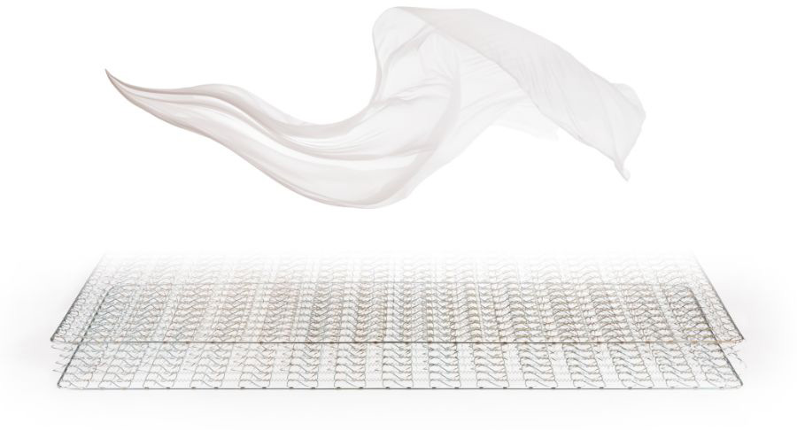 「高密度連続スプリング®」は1本の鋼線を緻密に編みあげる高度な製法により、継ぎ目のない一体化した中空構造を実現。高温多湿な日本の環境に適した設計で、内部に空気をこもらせず換気しやすい構造で、すばやく湿気を放出させるため衛生的です。国内で唯一フランスベッドだけが生産しています。