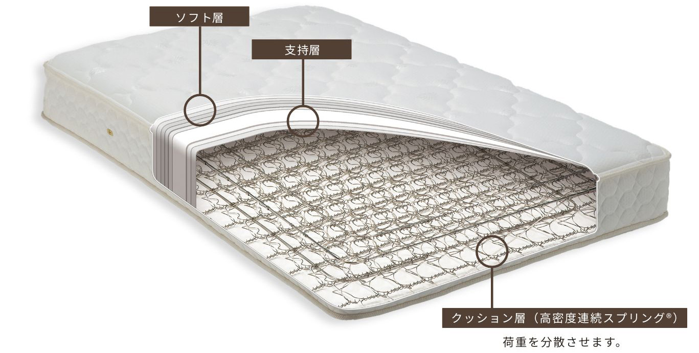 高密度連続スプリング®︎の適度な硬さで体全体を面で支え、腰の沈み込みのない、理想的な寝姿勢をつくります。